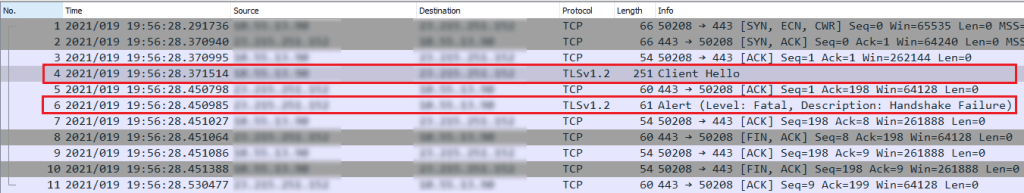 From here we see the client reaches out with the TLSv1.2 hello, but further down the server returns with “Handshake Failure”.