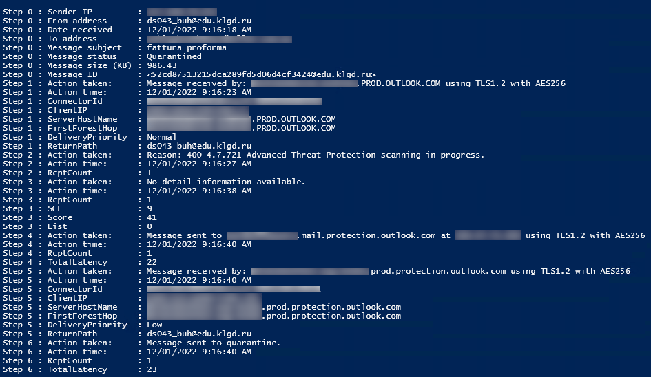 Recently I needed to dig through some email using the Exchange Online PowerShell module and I found the default cmdlets a bit lacking in detail. Get-MessageTrace and Get-MessageTraceDetail show you enough, but sometimes you want to know more about the flow of an email from when it was received until it was ultimately delivered, marked as spam or quarantined. The graphical view at https://security.microsoft.com/quarantine is good and does give you pretty much everything you need, but I wanted to be able to see the spam scoring metrics and any additional details.